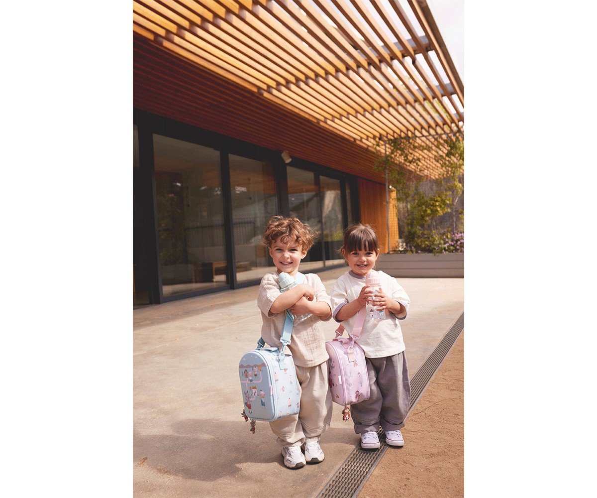 Tem uma pega comprida que permite pendurar na mochila ou no carrinho do bebé.